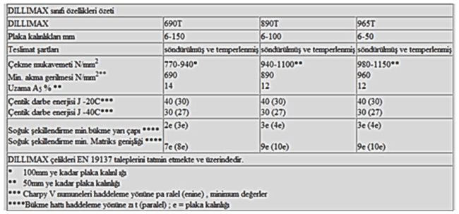 DILLIMAX'a ilaveten iki ayrı çelik cinsini size tavsiye ederiz. DILLIMAX 890 ve DILLIMAX 965.Bunlar eksterem yüklenme durumları için geliştirilmiş çeliklerdir. Tüm bu çelik türlerinin özellikleri aşağıda özetlenmiştir. Bu sınıftaki diğer ürünler talep üzerine teslim edilebilir : DILLIMAX 460, 500, 550 ve 620